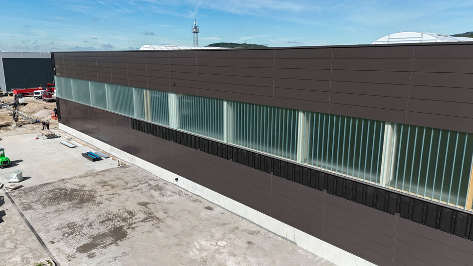 Bei der Gestaltung der Fassade des Produktions- und Lagerkomplexes kommen sogenannte Alucobond-Elemente zum Einsatz: Die großflächigen Platten vereinen maximale gestalterische Freiheit mit wirtschaftlicher Installation und zeichnen sich durch ihre Langlebigkeit und Witterungsbeständigkeit aus.