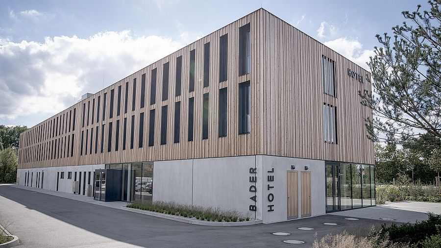 "Stefan Beschorner kreierte ein nachhaltig gebautes, elegant-puristisches Hotel, das die Natur in all ihren Facetten widerspiegelt. Die schlichte Gebäudeform steht für Harmonie und Eleganz. Das Erdgeschoss mit seinem monolithischen Charakter aus Sichtbeton gibt Standfestigkeit. Die Lärchenholzverkleidung der Fassade im Obergeschoss vermittelt durch die im Binärcode angeordneten Leisten Lebendigkeit und stellt gleichzeitig den Namen „Bader“ dar. Die Fenster der einzelnen Zimmer sind von unterschiedlicher Breite und so angeordnet, dass sich beim näheren Hinsehen eine Wellenbewegung zu ergeben scheint." – Quelle: Bader Hotel